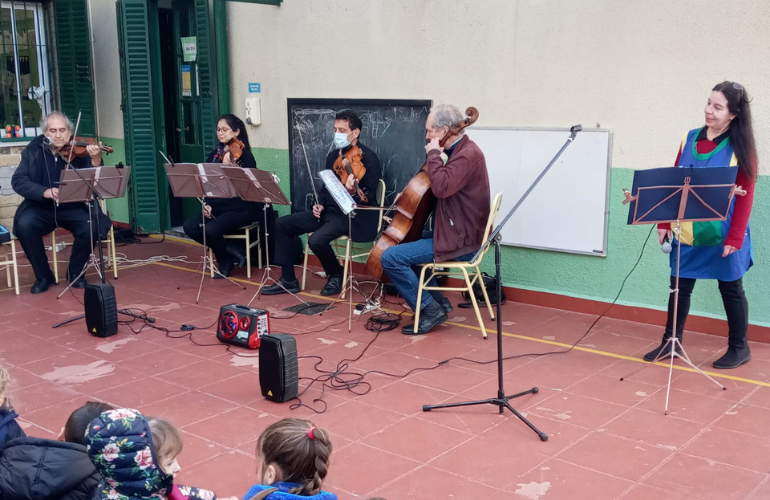 Las y los niños compartieron un espectáculo musical a cargo del grupo, que está integrado por una conductora y un cuarteto de cuerdas.Este mes, las Salas del Nivel Inicial disfrutaron de un concierto didáctico especialmente pensado para las y los más pequeño... Ampliar